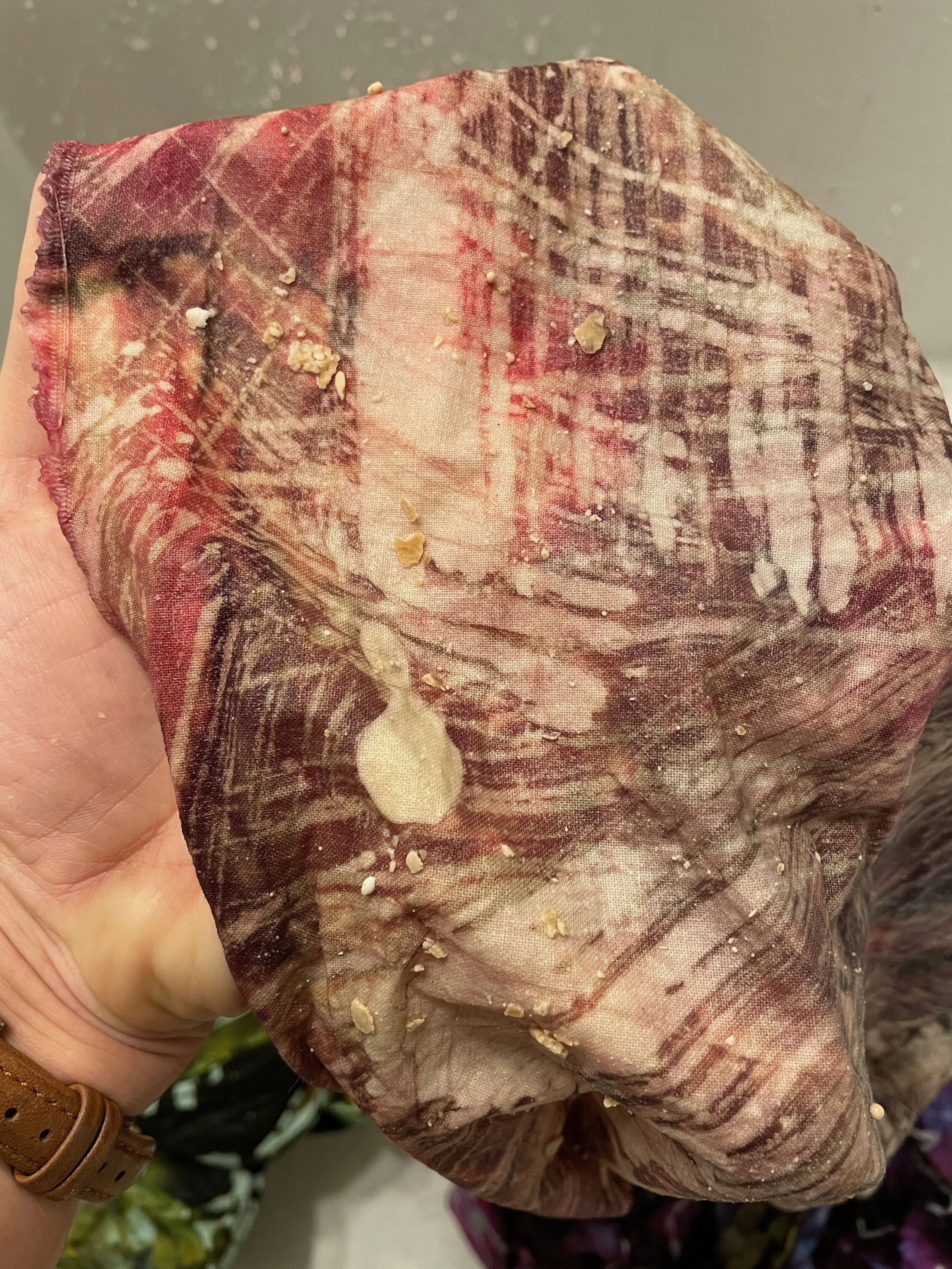 The final step in the boil-out process is to get off all the cold little wax “dingleberries” (as I call them) that might be clinging to the fabric. Note that the wax at this stage should only be beaded up on the surface of the fabric, not still embedded in the fabric!